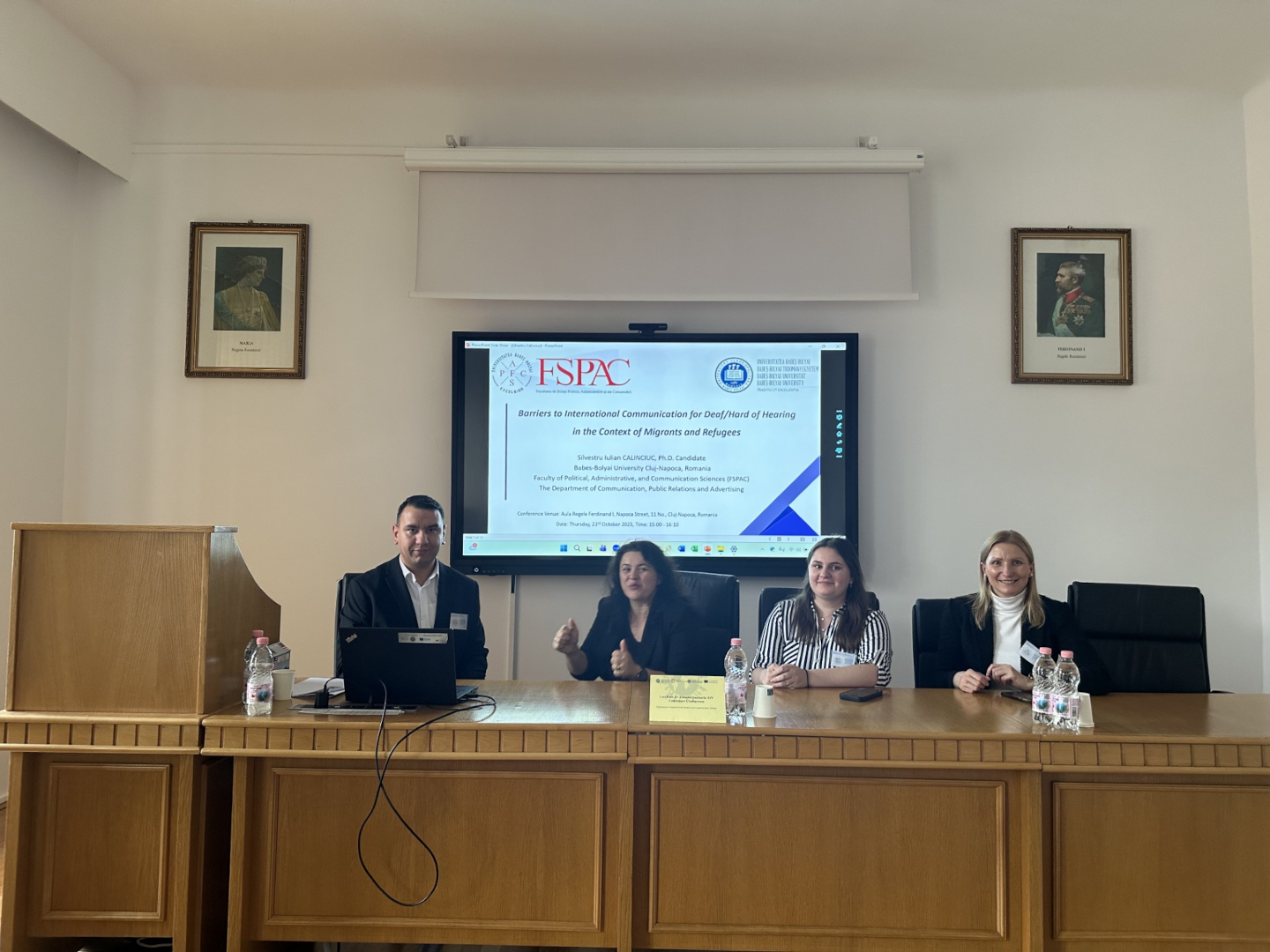 Mr. Silvestru-Iulian Calinciuc, a third-year Ph.D. candidate at the Doctoral School of Communication, Public Relations, and Advertising of Babeș-Bolyai University, Cluj-Napoca, Romania, participated with the presentations entitled “Barriers to International Communication for Deaf and Hard of Hearing Persons in the Context of Migrants and Refugees” at the Twelfth Edition of the Conference “Migration Dynamics and New Trends in European (In)Security” held on November 23–24, 2025, at the Faculty of History and Philosophy, Cluj-Napoca.
