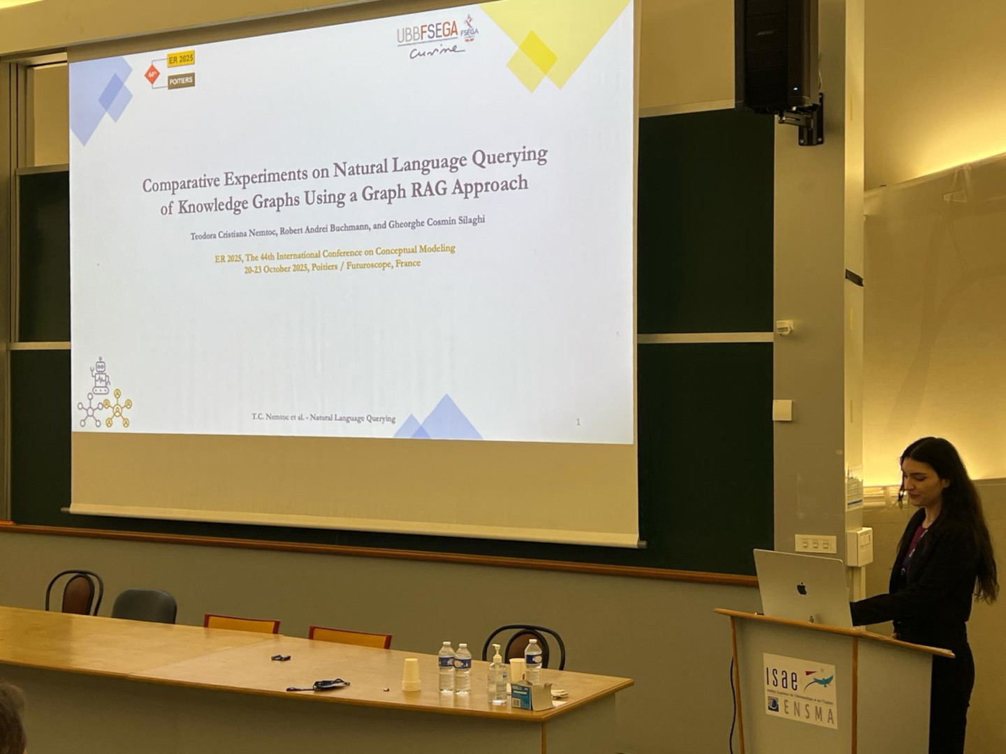 Teodora Cristiana Nemțoc, PhD student in Business Informatics supervised by Prof.dr. Gheorghe Cosmin Silaghi within the Doctoral School of Economics and Business Administration, participated in the ER 2025 – 44th International Conference on Conceptual Modeling, held in Poitiers, France, between October 20–23, 2025. The Conceptual Modelling conference is an established international venue in computer science, ranked in category A by the The Computing Research and Education Association of Australasia (CORE – https://portal.core.edu.au/conf-ranks/971/).