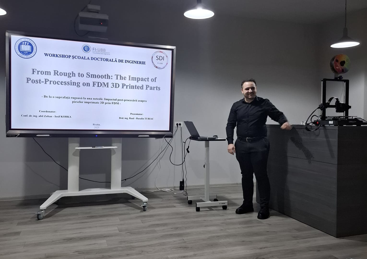 On November 19, 2025, the Doctoral School of Engineering organized a workshop entitled “From Rough to Smooth: The Impact of Post-Processing on FDM 3D Printed Parts,” presented by Drd. ing. Raul-Rusalin TURIAC.